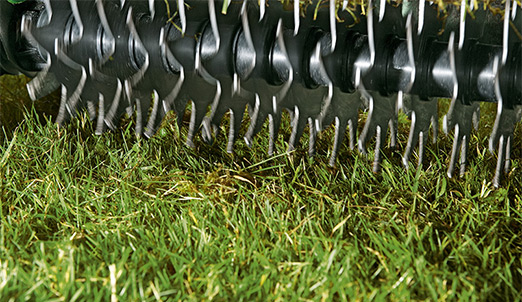 Scarifying is recommended for lawns that have a build-up of moss or thatch, where it is visible and / or springy underfoot. Scarification is the thorough mechanical raking of the lawn, including the soil surface. Regular scarifying (every year or at least every other year) will remove and control the build-up of ‘thatch’ (dead grass, rotted leaves and other lawn debris) and moss, as these can restrict the movement of water, air, fertiliser and other nutrients to the roots of the grass, all of which are needed for healthy turf growth.